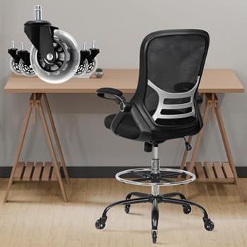 HYLONE Drafting Chair Tall Office Chair, High Ergonomic Standing Desk Computer Stools with Rubber Wheels, Flip-up Armrests, Adjustable Height and Foot-Ring, Comfortable Mesh Fabric, Black *New* Retail Price: $189.99